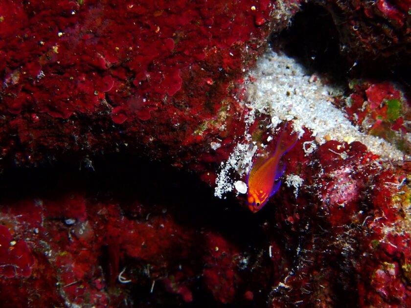 水中ライトを当てると、深い場所でもこんなに鮮やかな色が!サンゴと赤紫の魚、補色の関係が芸術的なのだ!