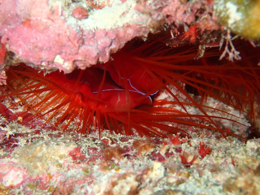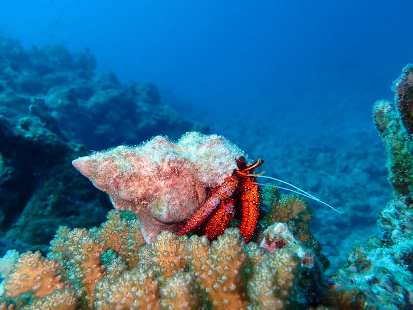 ハナヤサイサンゴから遠くを眺めていたコモンヤドカリ