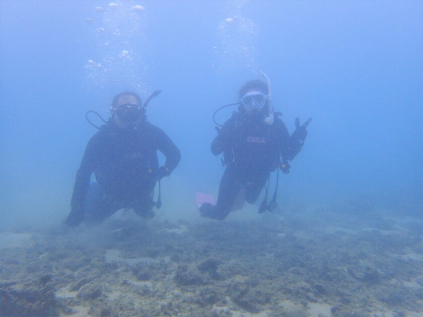 はいさーい!相変わらず窒素は溜まってもお金は貯まらないコーキでーす(^^)/ 今日は10年に一度の最強寒波の襲来で台風並の北風がビュンビュン吹きまくってしまい、ボートでのコースは全て中止してビーチでOWD講習のみ開催でーす!気温16.5℃ 水温21℃ 透視度10m 北風強風 曇り時々雨