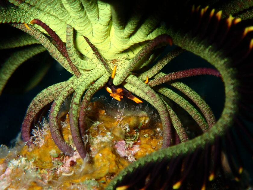 リュウキュウウミシダに住むコマチコシオリエビ 他にもキンギョハナダイ&アカネハナゴイ&ユメウメイロ&ロクセンスズメダイの群れなどなどウォッチング 【大崎カメハウス】透視度25m